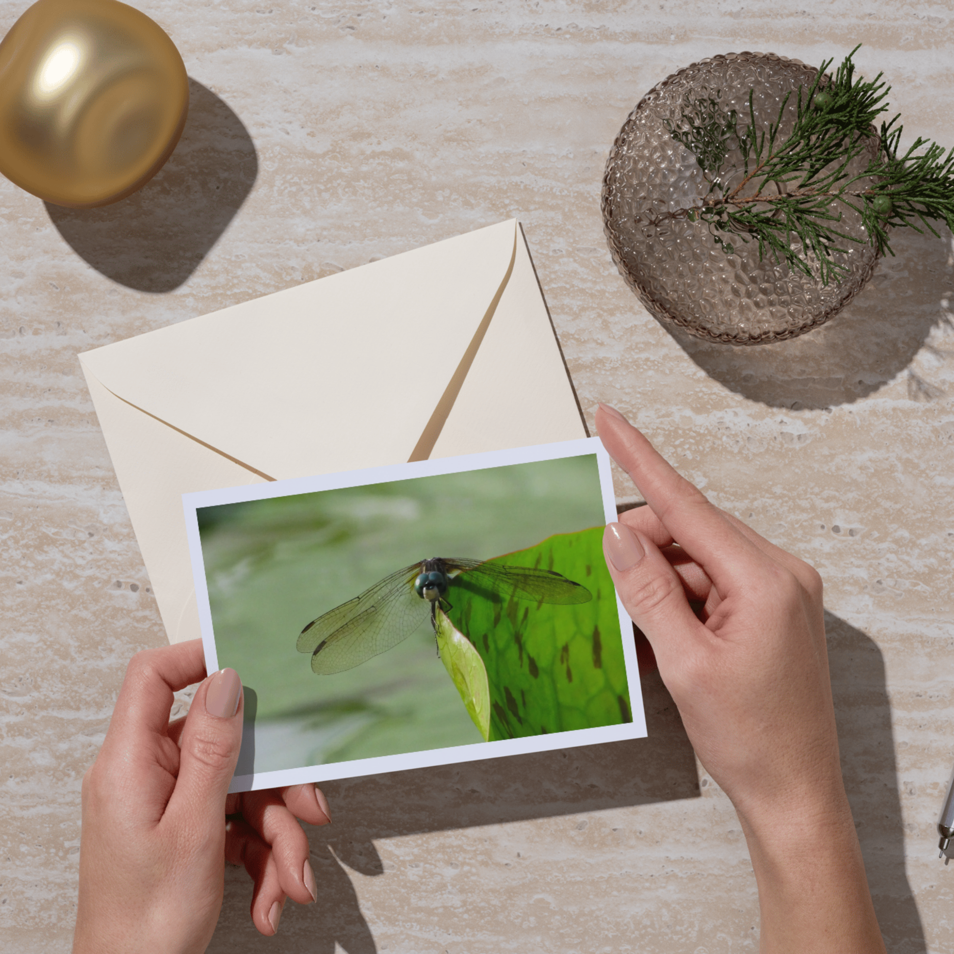 Art pieces are printed on either glossy or matte/luster paper, using archival-quality inks, and include matting. Greeting cards and postcards are offered on glossy or linen matte (true matte) paper and come with envelopes. Every print is sealed with a protective clear coating.