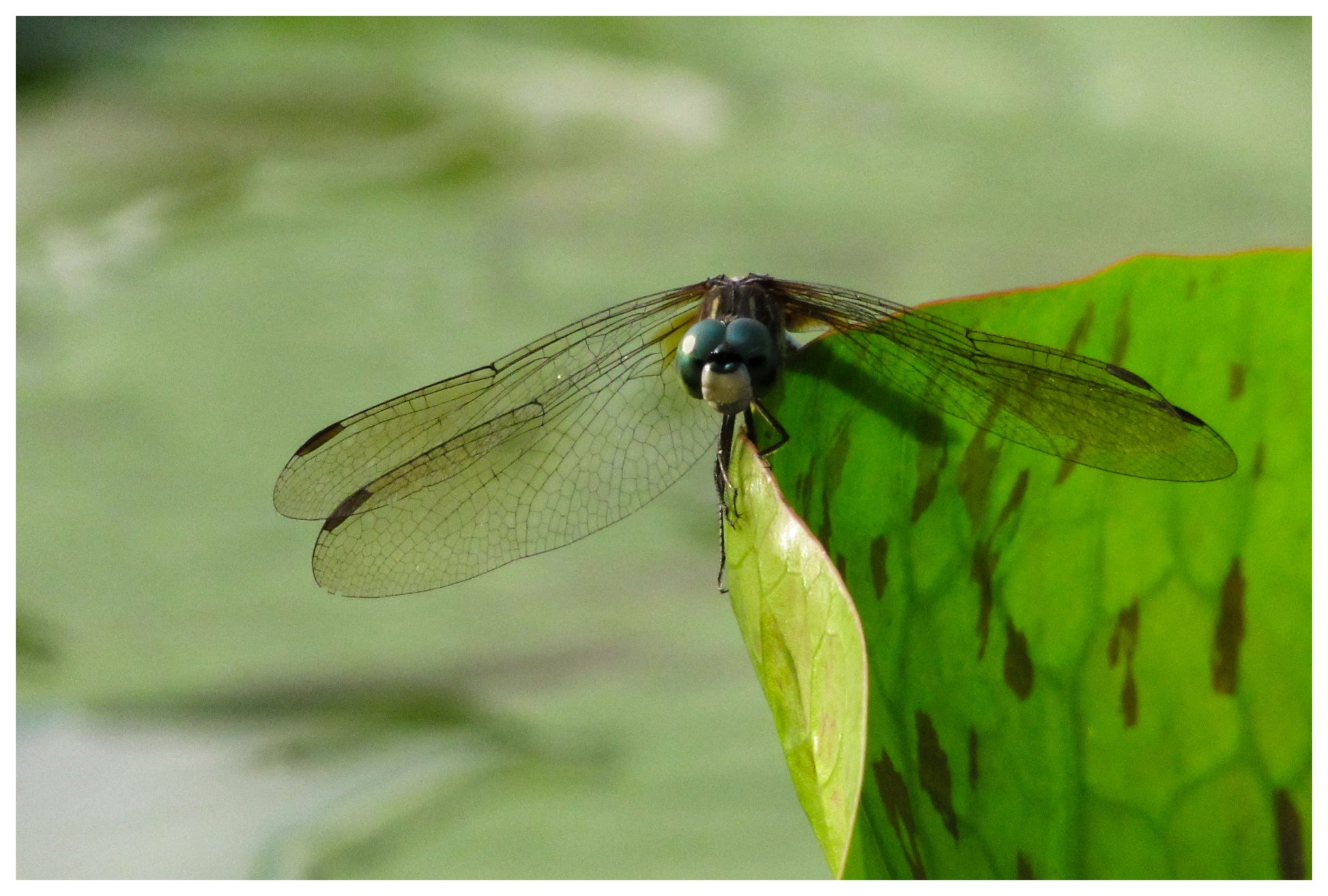 A blue dasher dragonfly practices its balancing act on the edge of a lily pad.