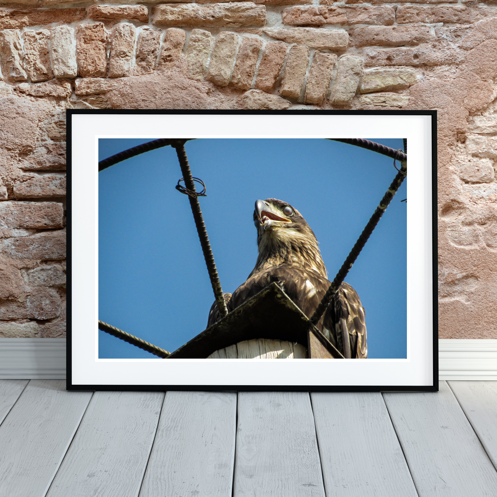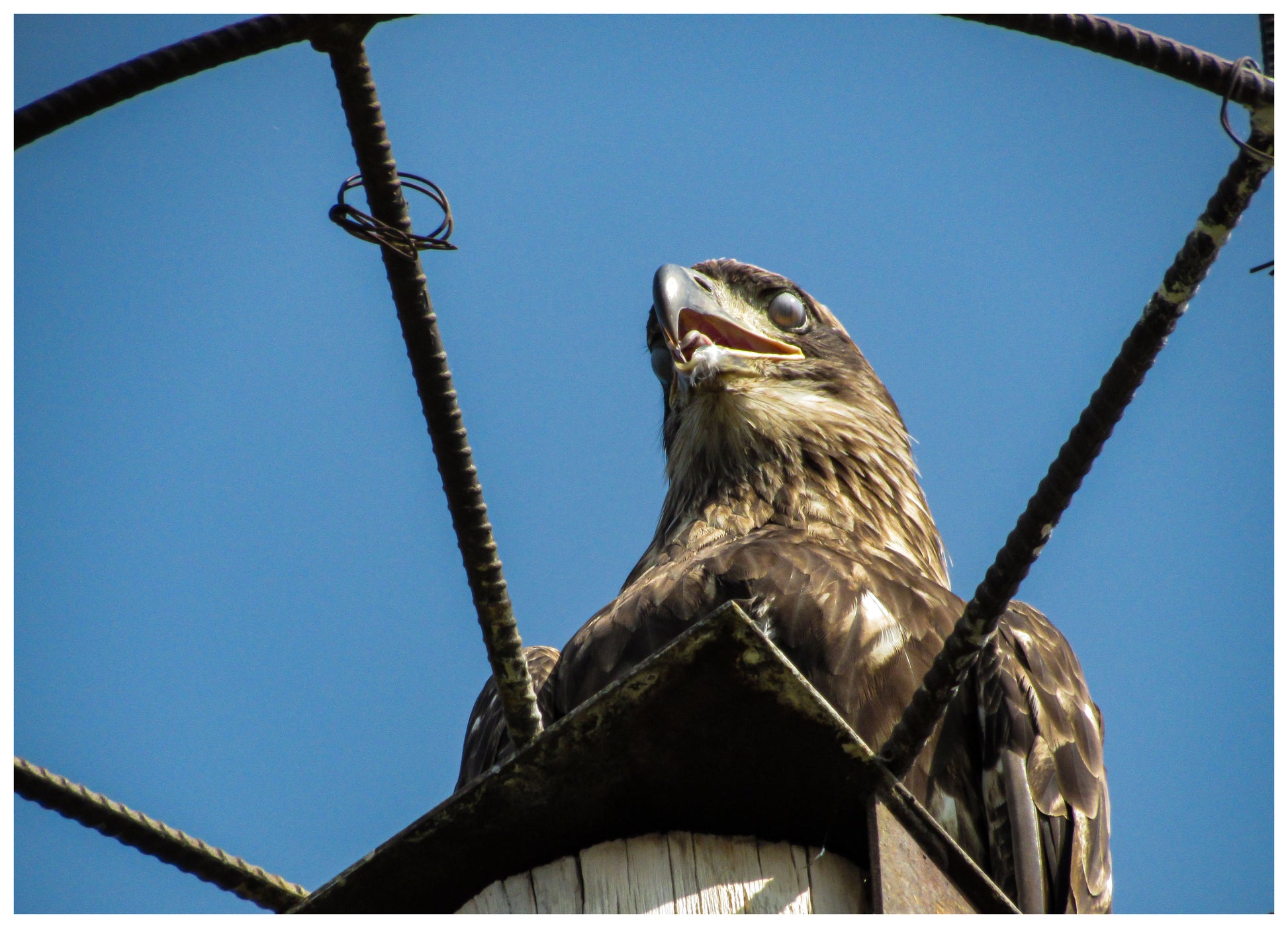 A juvenile bald eagle pants in Ellis Island's sweltering summer heat.