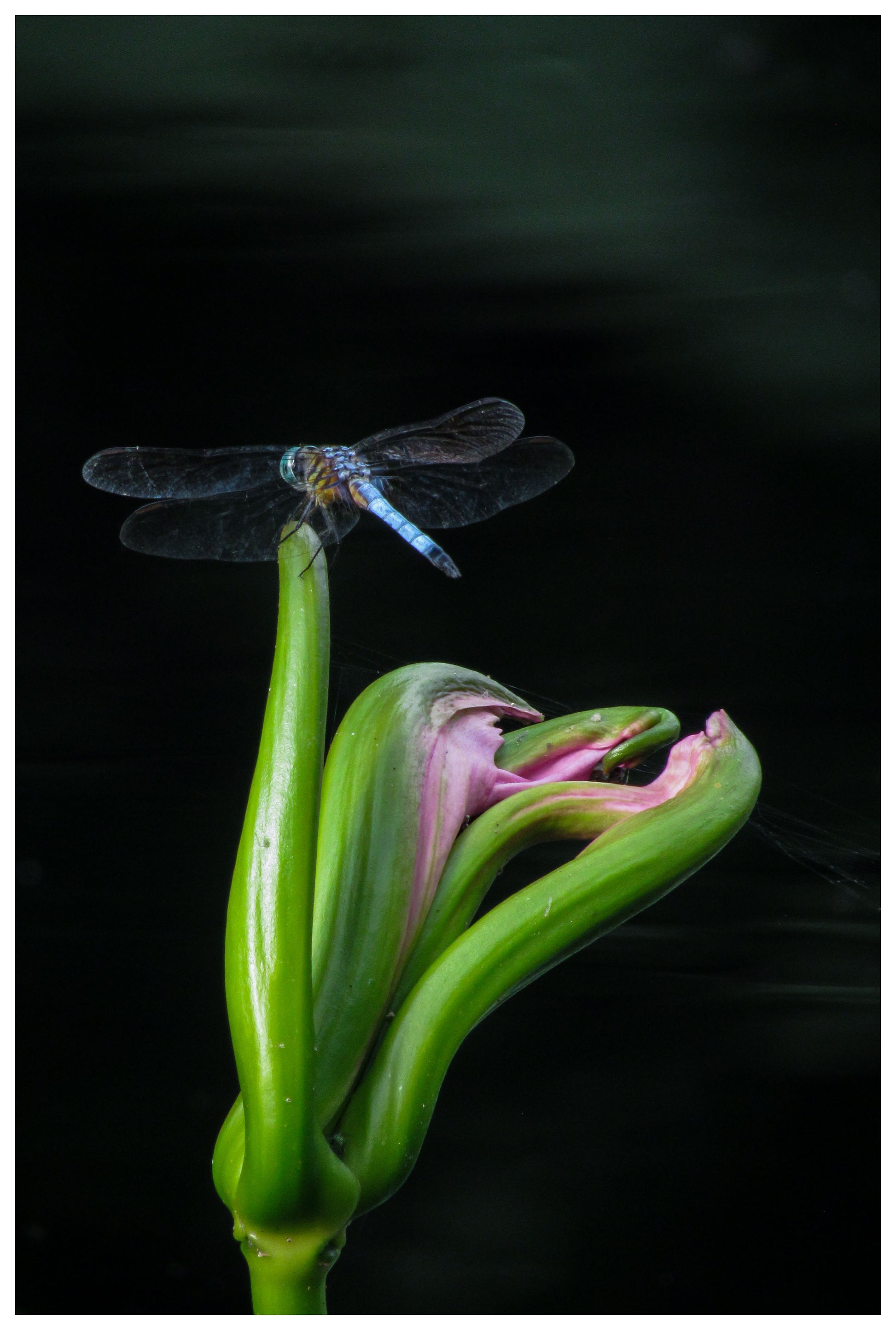 A blue dasher dragonfly rests atop an unfurling waterlily.