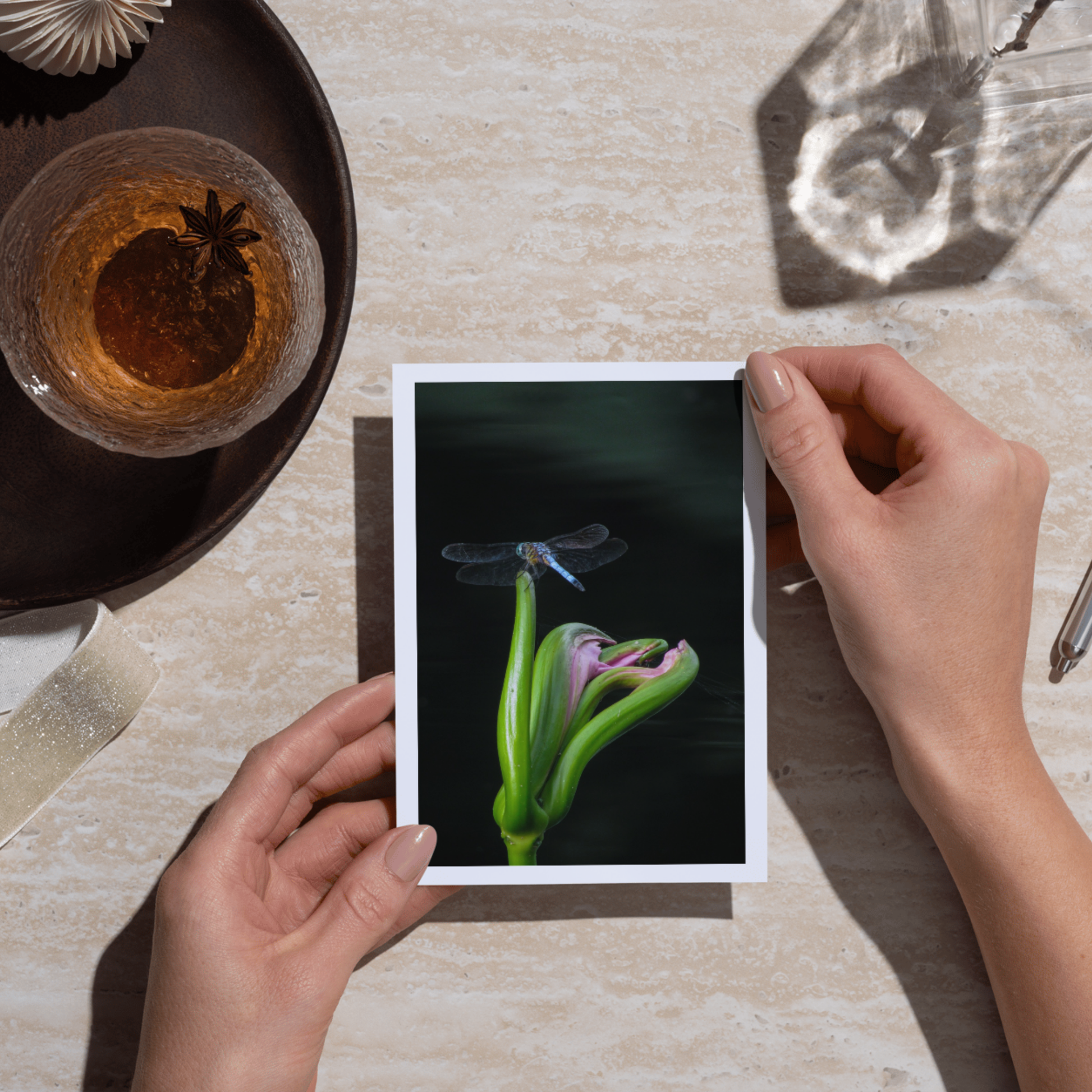 Art pieces are printed on either glossy or matte/luster paper, using archival-quality inks, and include matting. Greeting cards and postcards are offered on glossy or linen matte (true matte) paper and come with envelopes. Every print is sealed with a protective clear coating.