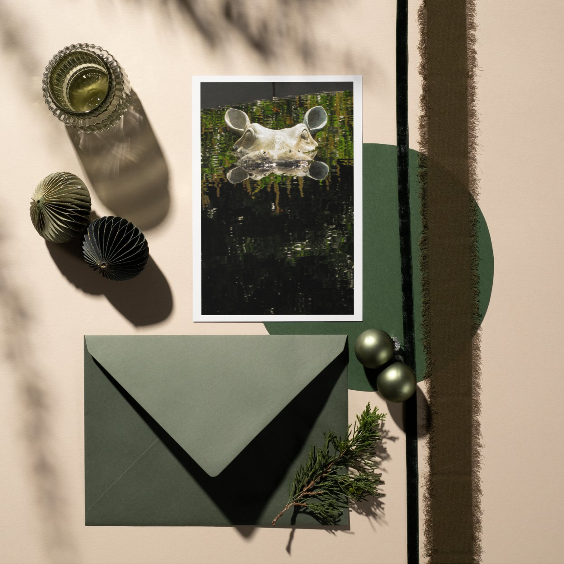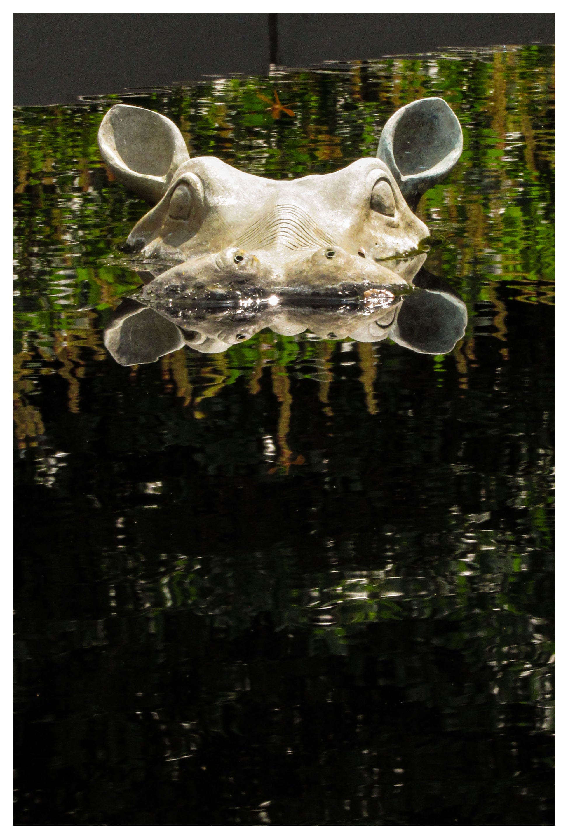 A statuesque hippo stealthily observing from its reflecting pool.