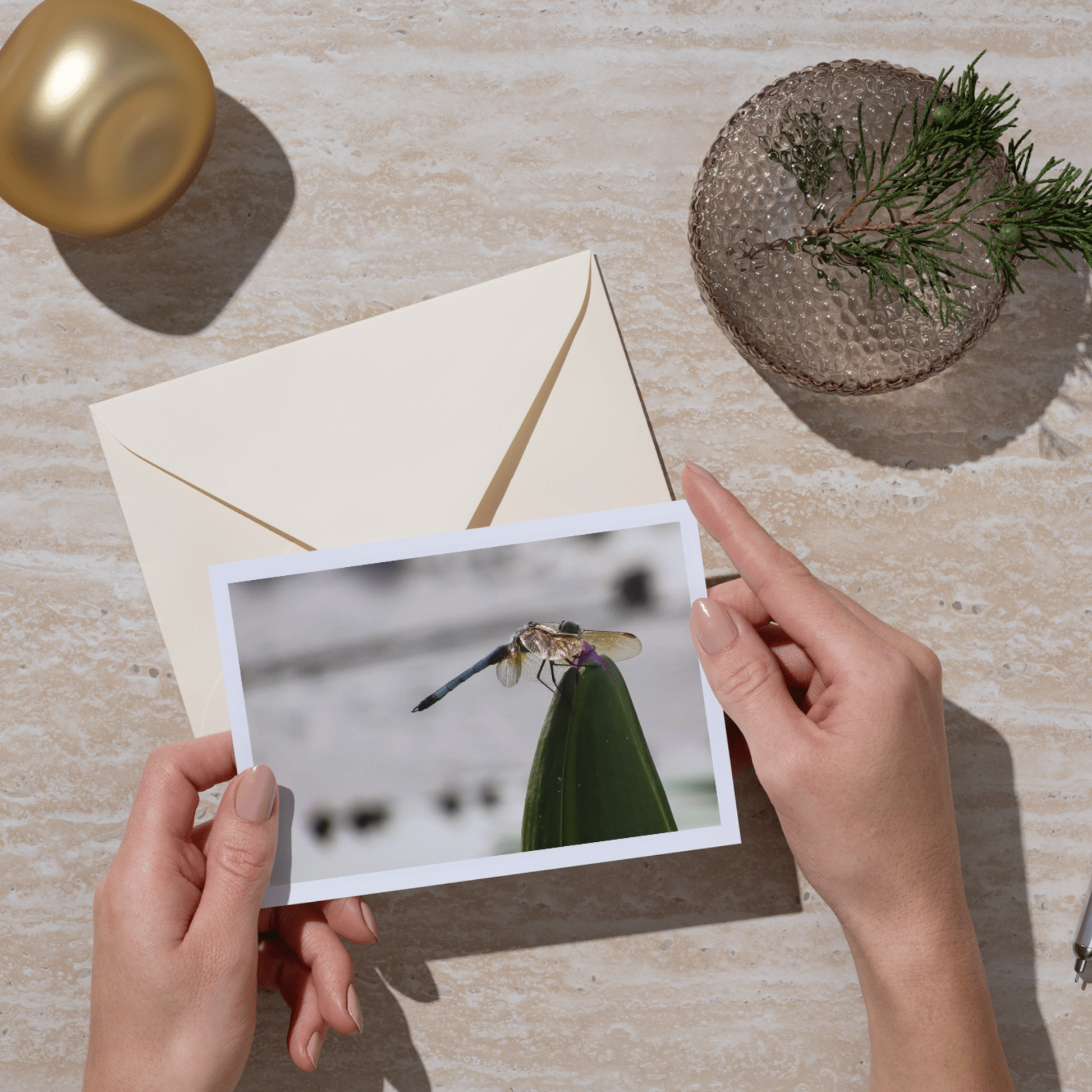Art pieces are printed on either glossy or matte/luster paper, using archival-quality inks, and include matting. Greeting cards and postcards are offered on glossy or linen matte (true matte) paper and come with envelopes. Every print is sealed with a protective clear coating.
