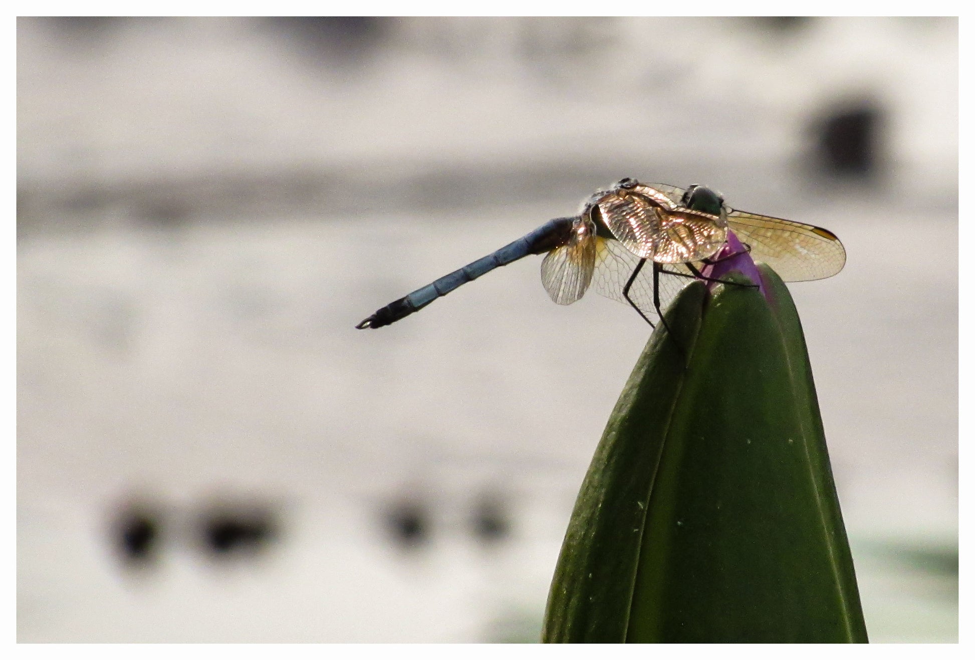A blue dasher dragonfly delicately grips a purple waterlily bud.